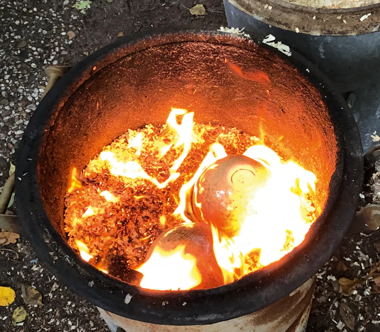 Die Entnahme der Keramiken im heißen Zustand macht den Brennvorgang zu einem echten Event. Durch das rasche Abkühlen und das Eintauchen in Materialien wie Laub, Stroh oder Späne wird das Brenngut bedeckt, wodurch die Glasur reduziert wird. Das Ergebnis sind wunderschöne Farbnuancen und das markante Krakelee an der Oberfläche, das jedem Kunstwerk einen einzigartigen Charakter verleiht.