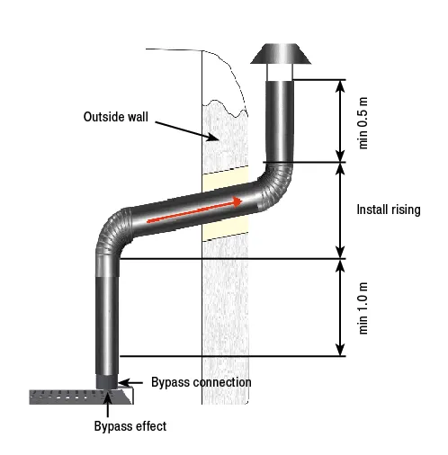 Für die Abgasführung ist eine maximale Temperatur der Abluft von ca. 200 °C anzunehmen. Es besteht Verbrennungsgefahr am Bypass-Stutzen und an der Verrohrung. Es ist darauf zu achten, dass die Wanddurchführung aus hitzebeständigem Material besteht. Wir empfehlen, einen örtlichen Lüftungsbauer für die Auslegung der Abgasverrohrung zu kontaktieren.