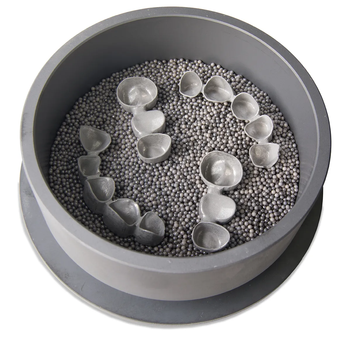 Der Einsatz von Sinterperlen sorgt in der Sinterschale für optimale Ergebnisse durch ihre reduzierende Wirkung. Außerdem verhindern sie ein Anhaften und Verklemmen der Kronen und Brücken während des Sintervorganges. Es ist darauf zu achten, dass die Gerüste und Einzelkronen bis zum Kronenrand mit Sinterperlen bedeckt sind, jedoch dürfen diese nicht im Inneren der Kronen liegen, da dies anderenfalls den Sinterschrumpf behindern könnte.