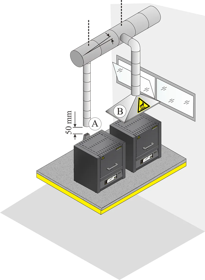 Es gibt unterschiedliche Ableitungsmöglichkeiten. In den meisten Fällen wird der Ofen unter einer kundenseitigen Ablufthaube platziert (B). In diesen Fällen empfehlen wir einen Abzugskamin zu verwenden, der die entweichenden Gase nach oben hin ablenkt.