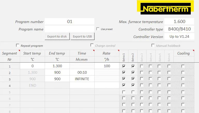 La introducción de programas es mas fácil y mas confortable mediante el uso del software NTEdit para MS Windows™ (Freeware). El programa se puede editar en el PC y luego ser exportado al controlador (B500, B510, C540, C550, P570, P580) con una memoria USB proporcionada por el cliente. El interfaz de presentación de la curva predeterminada en el PC puede ser gráfico o tabular. La importación de programas también es posible en NTEdit. Con NTEdit, Nabertherm proporciona una herramienta gratuita y fácil de usar. Un requisito previo para el uso es la instalación de Excel™ (cliente) para MS Windows™ (de la versión 2007). NTEdit está disponible en ocho idiomas (DE/EN/FR/ES/IT/CN/RU/PT).