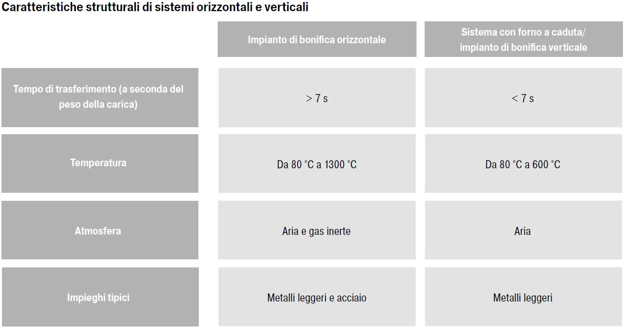 La tabella seguente evidenzia alcuni tratti distintivi fondamentali di sistemi orizzontali e verticali. Nella variante orizzontale, il bagno di raffreddamento è posto prima del forno a camera. La carica viene trasferita nel forno grazie a un manipolatore a due assi che trasla in orizzontale e poi da lì prelevata, dopo il trattamento termico ancora molto calda, per farla raffreddare. La tecnologia di movimentazione di impianti così concepiti viene a trovarsi nella camera calda del forno solo per breve tempo e consente pertanto di raggiungere temperature fino a 1300 °C. Con forni a caduta, il bagno di raffreddamento si trova sotto la camera del forno. Questo tipo di struttura consente tempi di raffreddamento estremamente ridotti ed è pertanto particolarmente idonea a componenti a parete sottile. Nelle pagine seguenti, si procede a illustrare nel dettaglio le diverse concezioni di impianti.