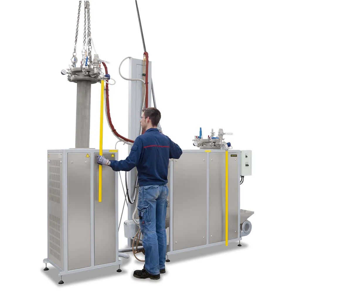 Retortę można wyjmować z pieca za pomocą dźwigu.