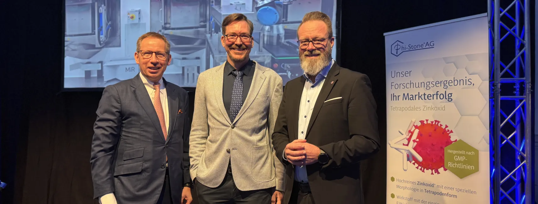 od lewej do prawej: Timm Grotheer (prezes Nabertherm GmbH), Andreas Roth (prezes zarządu Phi-Stone AG), Claus Ruhe Madsen (Minister Gospodarki, Transportu, Pracy, Technologii i Turystyki kraju związkowego Szlezwik-Holsztyn, CDU)