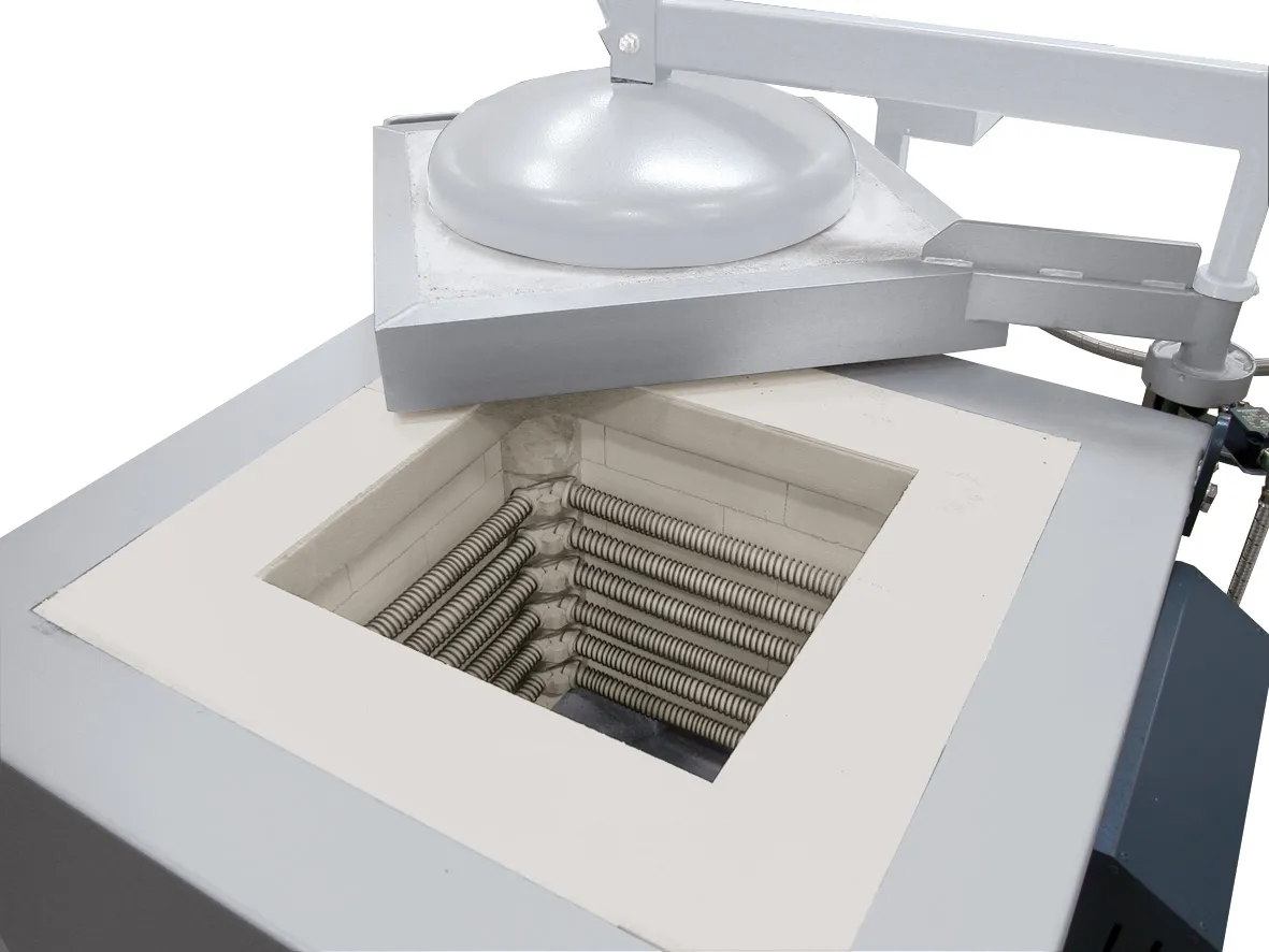 The crucible furnaces of the T .. product lines can be equipped with an optional pneumatic lid opener. The pneumatic lid opener is activated by depressing a foot pedal. Optionally, the pneumatic lid opener can be controlled and triggered by an external signal to fully automate the ladling process. The furnace lid swings to the side and the operator has free access to the crucible. This practical feature increases energy efficiency because the furnace is only open during charging and bale-out. Over 50 % energy savings can be realized with the pneumatic lid opener vs. an always open furnace (see tables for energy consumption for each model of melting furnace).