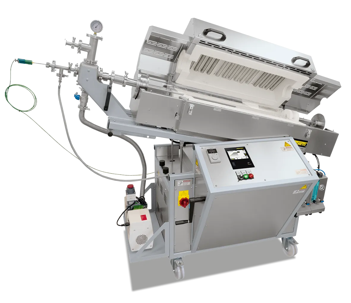 - Reactor is removed for emptying out of the rotary tube furnace. Beltless drive and hinged furnace housing (opening temperature < 180 °C) provide for very easy removal through